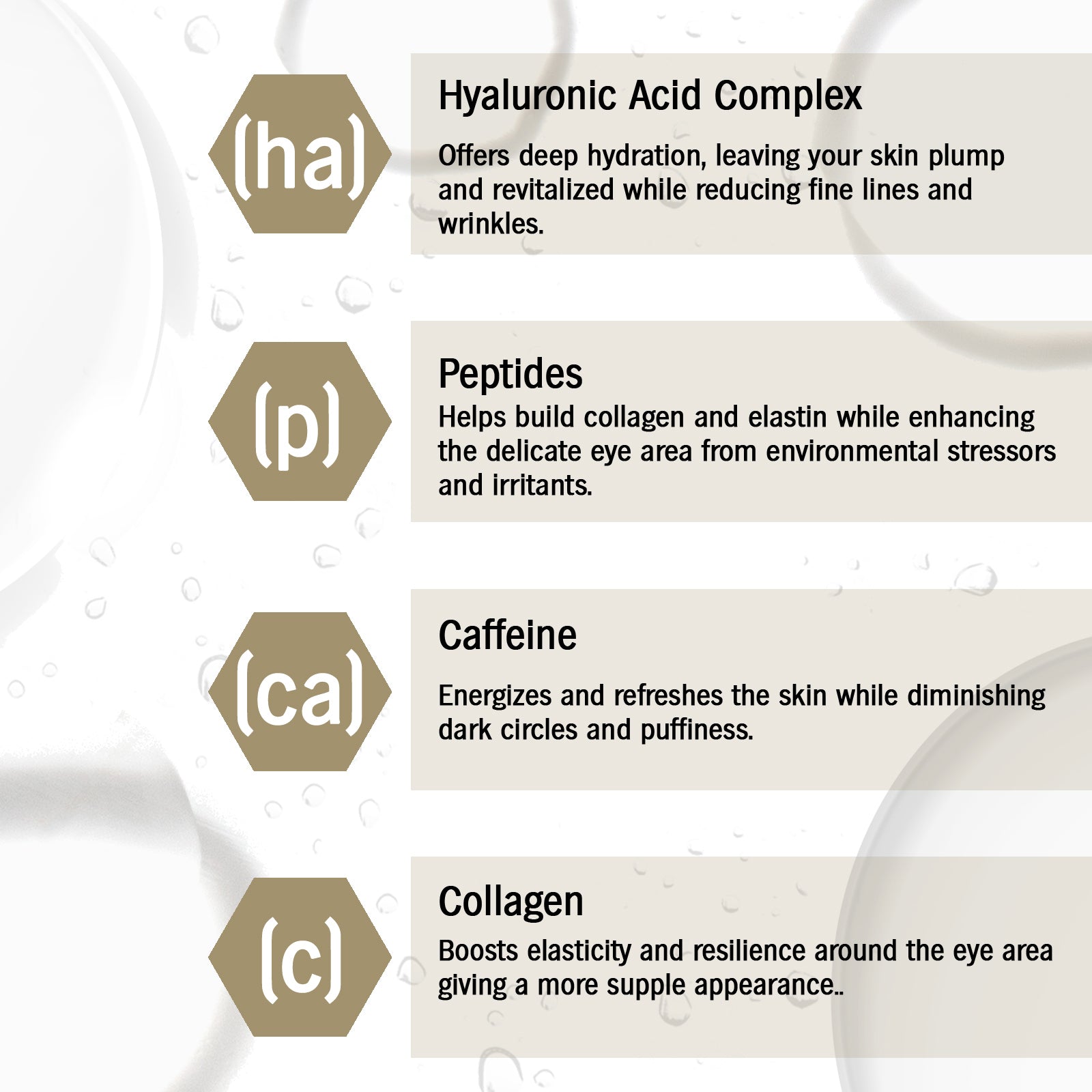 • Caffeine: Reduces puffiness and dark circles by improving circulation and decreasing fluid retention.